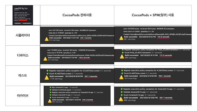 * 첨부파일 #1 : CocoaPods, CocoaPods + SPM 시 속도 차이 (확대해서 보세요)